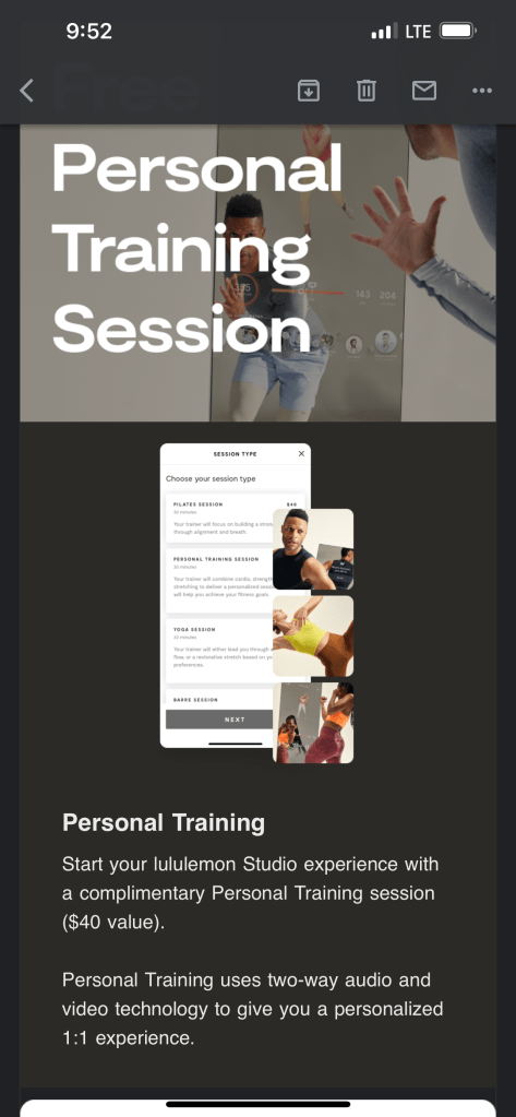 Original review from winter of 2022: I have been working out with the Lululemon Mirror (a.k.a. Lululemon Studio after their rebrand) for the last few weeks after getting it for free (you still have to pay the $39/month subscription, but you can use the code PERKSATWORKZERO to get the hardware completely free, including free delivery and no taxes.) As of January 1, 2023, this promo code no longer works and you can’t get The Mirror for free.